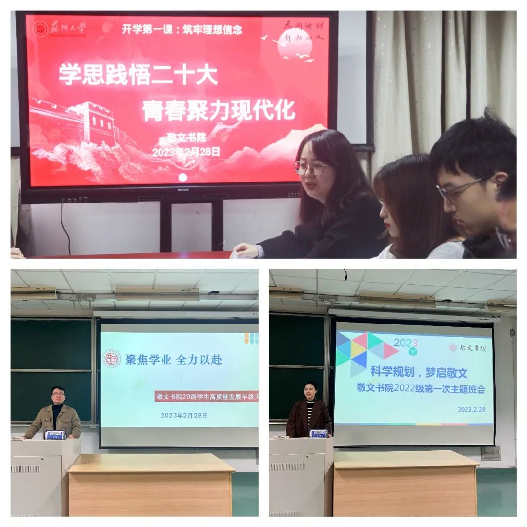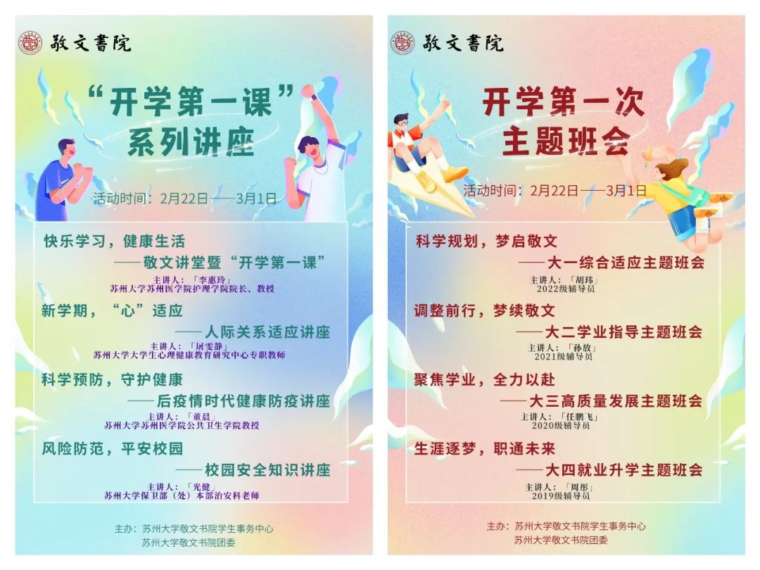 开展2023年春季学期“开学第一课”系列活动是本年度教育部思想政治工作的要点内容,也是学校深入推进“铸魂逐梦”工程的重要举措。为引导学生坚定理想信念,尽快适应疫情防控政策变化后的新学期,敬文书院于2月22日到3月1日顺利举办“开学第一课”系列活动,为同学们续航新学期、奋进新征程起到了思想引领、保驾护航的重要作用。