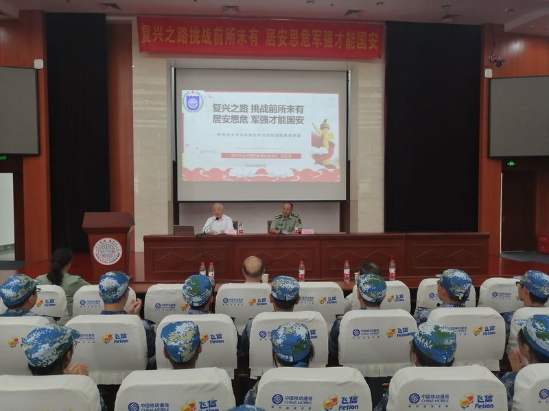 为纪念抗日战争胜利暨反法西斯战争胜利75周年,进一步贯彻落实立德树人根本任务,全面推进国防教育工作,提高大学生的国防观念和国家安全意识,助推学生工作高质量发展。9月21日下午,在阳澄湖校区报告厅,学校邀请原苏州市委常委、苏州市军分区政委、苏州市全民国防教育协会会长肖汉涛大校到校,以“复兴之路挑战前所未有,居安思危军强才能国安”为主题为八百余名新生上了一堂生动的国防教育课,讲座由人武部副部长张镇华主持。