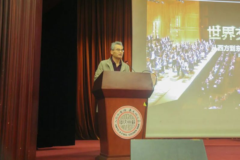 3月8日下午,敬文讲堂第217讲在校本部敬贤堂举行。本次讲堂特邀中国交响乐发展基金会理事长、苏州交响乐团团长、国家一级演奏员陈光宪先生,主讲题为《世界交响乐的风格和特点》的专题讲座。本次讲座由敬文书院院长钱振明主持。
