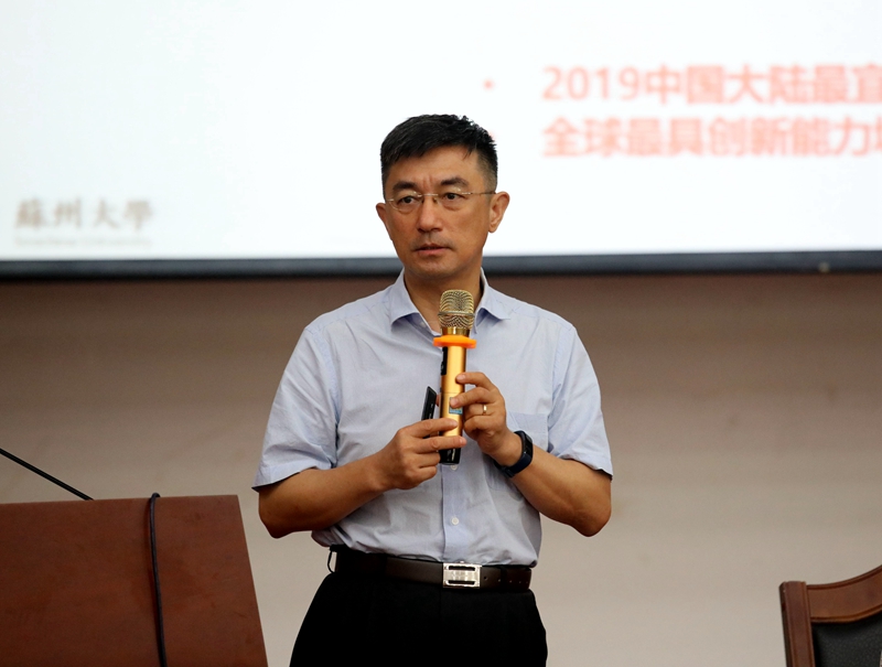为了帮助大家深入了解学校的人才培养创新模式,江书记向同学们介绍了苏州大学一流本科教育改革行动计划、科研发展战略等举措,希望同学们充分利用学校联合培养项目和交流项目进修学习,努力成长为会思考、会学习、有创造力、适应未来社会发展的卓越人才。