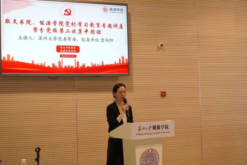 2024年5月15日下午,根据党中央关于开展党纪学习教育的决策部署,为深入学习贯彻修订后的《中国共产党纪律处分条例》,敬文书院、能源学院于能源学院多功能厅举行党纪学习教育专题讲座暨分党校第二次集中授课。本次党纪学习教育专题讲座特邀苏州大学党委常委、纪委书记、派驻监察专员宫向阳主讲。本次党课由能源学院党委书记沙丹丹主持,两院师生党员、分党校培训班全体学员共同参加本次党课。