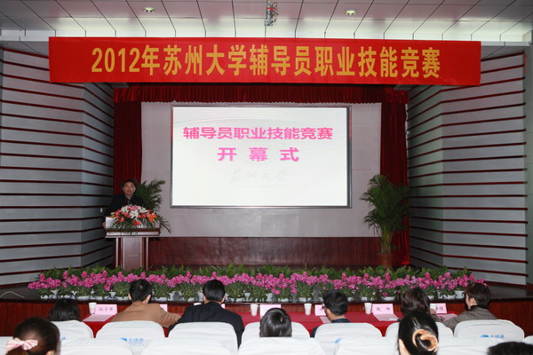 4月6日,2012年苏州大学辅导员职业技能竞赛在本部红楼学术报告厅举行。校党委副书记、副校长江涌以及由学生工作指导委员会各部门的领导和专家组成的评委团莅临比赛现场,各学院(部)学生工作干部到场观摩。此次竞赛包括自我介绍与展示、才艺表演、基础知识测试、微博写作、主题班会、谈心谈话、案例分析等七个项目。全校共有17个学院(部)的24位辅导员报名参赛。