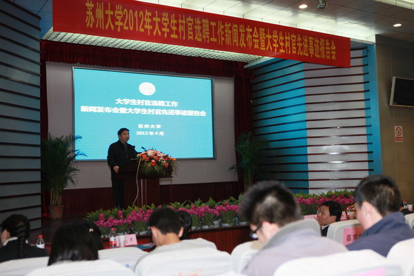 4月6日下午,我校 2012年大学生村官选聘工作新闻发布会暨大学生村官先进事迹报告会在校本部学术报告厅召开,吸引了数百名同学到场咨询聆听。  泗阳县新经济社会组织、社区党工委副书记、纪工委书记裴绪如,泗阳县委组织部人才科办事员毕才以及石磊,赵海杰,陈雨3位优秀大学生村官应邀出席发布会。我校党委副书记、副校长江涌,学生工作部(处)长张国华以及相关部门、学院(部)负责同志参加此次会议,新闻发布会由张国华主持。