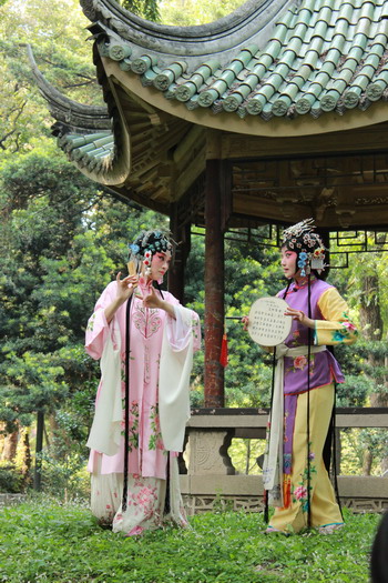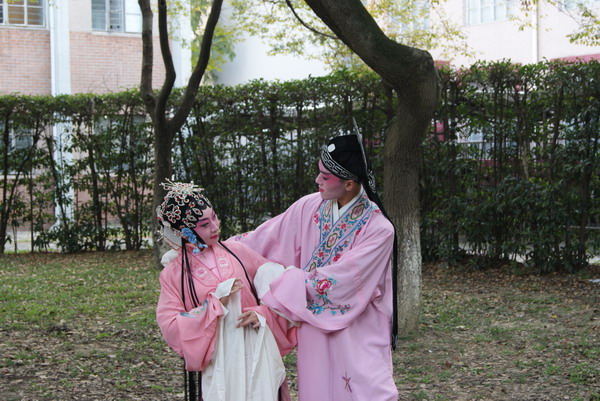 活动中,同学们除了能在现场近距离的欣赏到苏州昆剧院艺术家们的精彩演出外,更能够看到昆剧化妆师们是如何为昆曲演员化妆、束发、佩戴头饰、穿戴戏服的。此外,昆剧院的老师为同学们详细地介绍昆曲的文化由来、历史典故、服饰装扮的奥秘、唱念做打的演出技巧等,为大家逐一破解了昆曲艺术传奇的奥秘。参加活动的大学生们被昆曲靓丽的妆扮深深吸引,纷纷举起手中的相机和手机,记录下这精彩的一幕。不少同学表示,过去从来不知道昆曲演员的头发是用黑色的布绑上去的,前面的竟是用刨花水粘上去的,这次真是开眼界了。在活动体验环节,外国语学院英语专业博士研究生朱玲同学和体育学院本科生薛峰同学自告奋勇,尝试让化妆师为自己化了一次昆曲戏妆,穿了一回昆曲戏服,亲身尝试了一次穿越,并且站在沁心亭上由专业的昆曲演员现场教授和指导昆曲的基本功,扮演《牡丹亭》中的杜丽娘和柳梦梅,引起现场热烈反响。