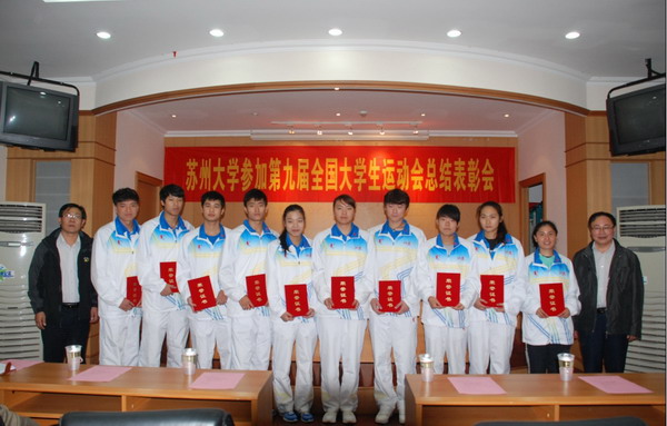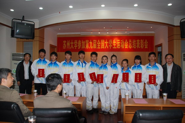 表彰会上,王家宏介绍了我校参加本次大运会情况。我校体育代表团在中华人民共和国第九届全国大学生运动会上,共获得5金6银9铜,破两项大运会纪录,为江苏省代表团总分1336.5分贡献了263.66分,位居江苏高校之首,为江苏省代表团获得团体总分第四名做出了突出贡献。同时,我校积分位列全国参加大运会高校第七名,获“校长杯”奖,创我校历史最好成绩。 江涌代表学校对取得优异成绩的教练员和运动员表示热烈祝贺,对为参加此次大学生运动会作出积极贡献的学校相关部门和师生表示感谢。他宣读学校的表彰决定,授予体育学院“先进集体”称号、陈钢等5人“优秀教练员”称号、葛小宝等32人“优秀运动员”称号。随后,向表彰人员进行了颁奖。