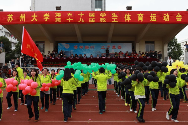 最后,文正学院、应用技术学院和东吴商学院分别获得学生田径比赛男女团体总分前三名,物理科学与技术学院、应用技术学院、王健法学院、计算机科学与技术学院、纺织与服装工程学院、教育学院、政治与公共管理学院、东吴商学院、医学部九个学院(部)荣获“道德风尚奖”,文正学院,机电工程学院沙钢学院获“优秀组织奖”。教工团体比赛前三名分别为体育学院和机关党工委、文正学院、应用技术学院。校运会的成功举办,为苏大全体师生构建了全民健身、和谐兴校的良好氛围,同时拉近了老师与学生的距离,友谊和进取的体育理念因校运会而更加深入人心。