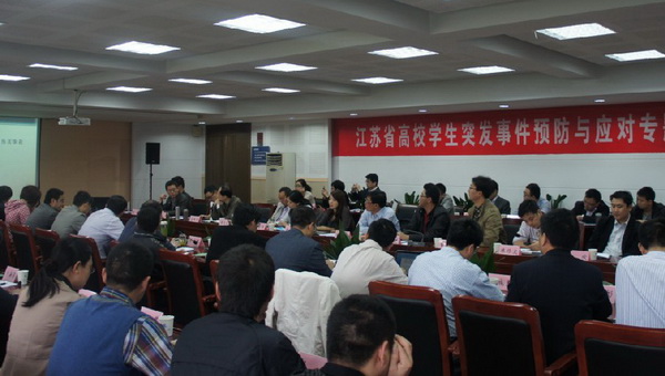 5月6日-8日,江苏省高校辅导员示范培训项目“高校学生突发事件预防与应对”专题研修班在我校举行。这是江苏省首次围绕该主题组织开展的专项培训活动。来自全省63所高校的学生处、院系负责学生工作的同志参加了本次培训。  江苏省教育厅副厅长朱卫国、我校党委书记王卓君、省教育厅高校学生处副处长张兆臣出席了培训班的开班典礼。我校党委副书记、副校长江涌主持开班典礼。