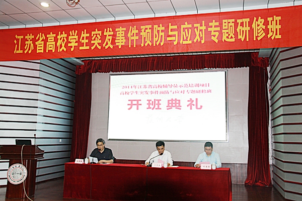 6月4日——6日,江苏省高校辅导员示范培训项目“高校学生突发事件预防与应对”专题研修班在我校举办。这是我校第二次围绕该主题组织开展的专项培训活动。来自全省52所高校的学生处、院系负责学生工作的128名同志参加了本次培训。 我校副校长江作军、学生工作部(处)部(处)长陈晓强、团委书记肖甫青出席了培训班的开班典礼。陈晓强主持开班典礼。