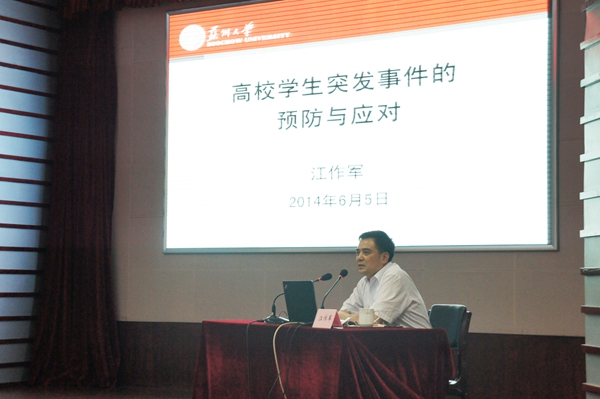 6月5日上午,苏州大学法律顾问朱卫琴律师作了题为《高校突发事件的预防与应对的基础技能》的主题讲座。她针对大学生教育管理服务工作所涉及的法律法规作了讲解与指导,探讨了突发事件处理过程中遇到的一般法律问题,分享了部分实用技能,加强了辅导员依法行政的教育管理理念,让辅导员能够更好的学法、懂法、守法、用法。 6月5日下午,江作军为学员作了题为《高校学生突发事件的预防与应对》的主题讲座。他从理论上分析了高校学生突发事件的概念、分类、特点以及高校学生突发事件发生的根源和影响。同时他还结合近年来的高校突发事件,深入分析了如何预防高校学生突发事件的发生以及高校学生突发事件应对与处置。帮助学员树立了突发事件预防与处置的整体性思维,让辅导员明确了处理高校学生突发事件是对辅导员职业能力的考验。