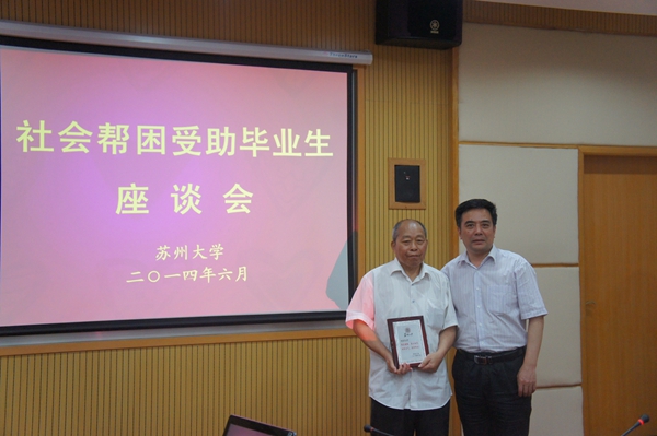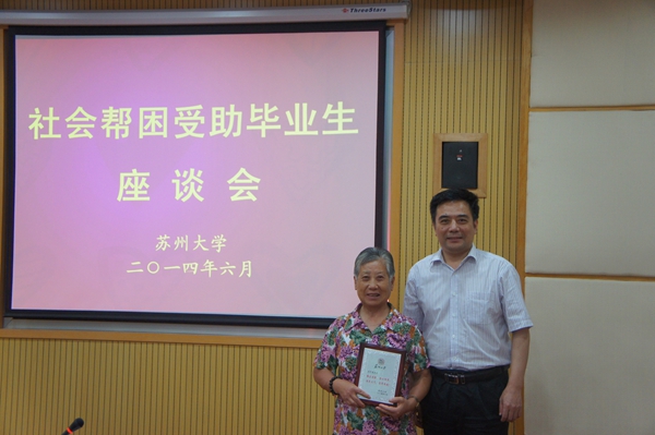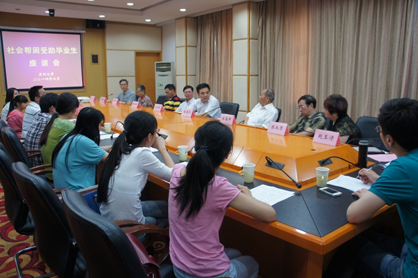 6月18日下午,苏州大学2014届社会帮困受助毕业生座谈会在本部红楼201会议室举行。我校副校长江作军,学生工作部(处)部(处)长陈晓强,苏州大学“助学红娘”、医学部退休教授张寿华老师,迅达电梯亚太事务管理有限公司首席信息官陈宝权先生,苏州清华酒楼董事长、总经理陈淼坤先生,苏州同济大酒店总经理陈淑琴女士,苏州市文化国际旅行社分公司经理张国金先生,苏州市社会爱心人士赵玉浔女士、沈水金女士等资助人代表,相关学院(部)负责老师以及全体受助毕业生参加了本次座谈会。座谈会由陈晓强主持。 陈晓强简要介绍了我校2014年社会帮困助学工作的相关情况。他指出,2014年度在社会各界的大力支持下,特别是在苏州大学“助学红娘”张寿华老师以及各位热心资助人的关心和帮助下,我校帮困助学工作取得了良好的成效。 随后,来自医学部的彭啟亮、社会学院的徐子理、电子信息学院的张俊以及医学部的唐敏分别作为受助毕业生代表发言。他们回顾了自己大学四年的成长和收获,并代表受资助的同学向张寿华老师和各位资助人表示深深的感谢。他们表示,将会永远铭记资助人的爱心,坚定理想信念,努力工作、深造,积极传递爱心,回报社会。 来自医学部的孙静老师作为工作在帮困助学一线的教师代表发言,她介绍了医学部学生的基本情况,分享了自身的工作经历,并代表学部感谢张寿华老师及社会爱心人士对医学部学生的关爱。 在接下来的资助人寄语环节中,资助人分别发言,他们对受助同学在校期间的出色表现表示欣慰,分享了自身成长或创业过程中一些难忘经历。同时对同学们寄予殷切的期待,希望同学们在未来的工作岗位上继续努力,常怀感恩之心,在有余力之时也能够帮助他人。 张寿华老师在发言中表达了对学校以及学校各级领导对帮困助学工作重视的感激之情,回顾了自己多年帮困助学的经历,也分享发起帮困助学活动的初衷,希望更多人可以加入帮困助学队伍,“众人拾柴火焰高”。他同时对即将毕业的同学表示祝贺,希望同学们不忘母校培育之恩,与母校保持联系,不忘社会关爱之情,“勿因善小而不为,勿因恶小而为之”,将爱心继续传递下去。