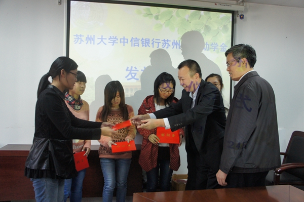 东吴商学院2013级金融学专业张倩倩同学作为此次获助学生代表发言,她在表达感激之情之余,表示会以更饱满的学习热情、更优异的学习成绩回报社会,践行“帮助他人,快乐自己”。东吴商学院2013级会计学专业葛小彤同学也表示会不断努力,心怀感恩,励志人生,用智慧和知识来努力回报社会,将爱的暖流传递下去。 马立新表示,近年来,中信银行坚持开展“五个携手”慈善活动,树立爱心银行的社会形象,践行社会责任,尤其重视对寒门学子的资助。他希望同学们奋发向上、全面发展,圆梦大学、回馈社会,让更多的人能够感受到社会的温暖。 随后,马立新为所有受助学生现场发放助学金。