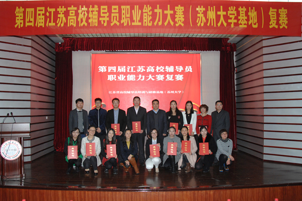 最后,江作军等嘉宾分别为获奖选手颁奖,本次竞赛至此圆满结束。 本次辅导员职业能力竞赛是苏州大学基地贯彻省教育厅相关文件的精神,为落实立德树人根本任务,促进辅导员专业化、职业化和可持续发展而推出的一项重要举措,也是我校第三次承办江苏高校辅导员职业能力竞赛基地复赛。经过一天半的紧张比赛,来自不同高校的选手们充分展示了自己的专业特长、综合素质以及业务技能。由此脱颖而出的苏州大学彭晓蓓、苏州科技学院天平学院陈东升、南通大学陈烨等三位优秀辅导员将再担重托,参加全省决赛选拔,备战全国辅导员职业能力竞赛。