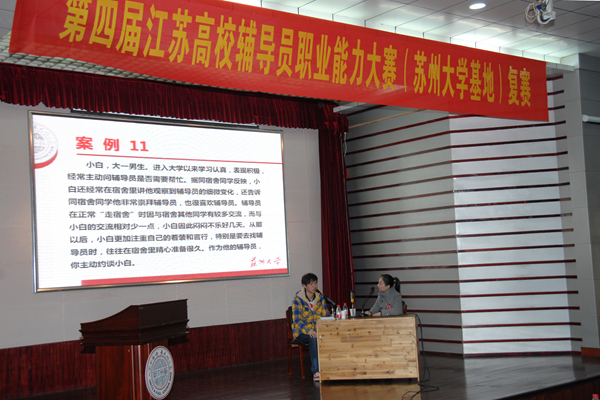 3月17日—18日,第四届江苏高校辅导员职业能力大赛(苏州大学基地)复赛在我校本部学术报告厅举行。我校党委副书记、副校长江作军,扬州大学学生工作部(处)部(处)长张信华,苏州经贸职业技术学院学生工作部(处)部(处)长沈巧明,我校学生工作部(处)部(处)长陈晓强,党委宣传部副部长、新闻中心副主任孙宁华,党委组织部副部长王成奎,计算机科学与技术学院党委书记胡新华,教育学院教育心理学教授黄辛隐等嘉宾莅临比赛现场。其中,张信华、沈巧明、孙宁华、王成奎、胡新华、黄辛隐等六位专家组成评委团。来自苏州、无锡、常州、南通、泰州5市18所本科院校与独立学院的18名优秀辅导员参加了竞赛。基地辖区的部分兄弟高校学生工作同仁以及我校全体专职辅导员到场观摩。 17日下午的开幕式上,江作军首先对远道而来的专家、同仁表示热烈欢迎和衷心感谢。他指出,辅导员职业能力大赛已成为推动辅导员队伍建设,提升辅导员职业能力的重要举措;也成为广大辅导员展示风采、交流经验、学习技能、提高水平的重要舞台。他对各位辅导员提出了三点希望:主动学习,夯实素质基础;主动交流,提高工作水平;自觉研究,提高育人水平。最后,他预祝本次大赛取得圆满成功,祝各位选手取得好的成绩。