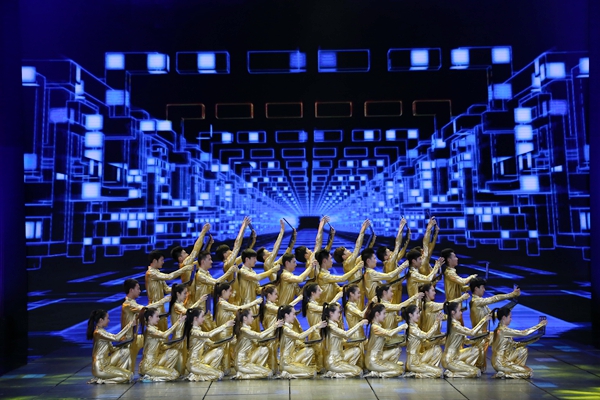 我校艺术教育中心在4月10日接到节目导演组邀请后,第一时间成立了节目策划小组,邀请相关艺术家参与并精心设计参演节目。最终决定在全国第四届大学生艺术展演一等奖作品《迎接明天》的基础上进行改编,重新制作音乐,并对节目进行重新设计与编排,力图表现当代青年学子在广袤的网络空间和浩瀚的信息海洋中,用新媒体传递正能量,为社会主义核心价值观代言,为青春点赞、为时代点赞、为实现伟大中国梦点赞!整支舞蹈苍劲有力,激情澎湃。