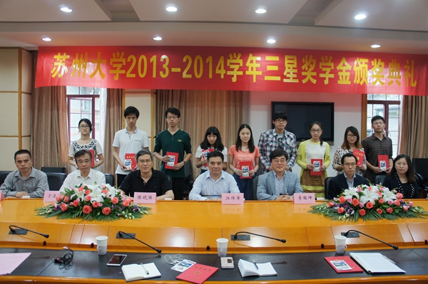 苏州大学三星奖学金是由中国三星于2002年11月在我校设立的奖学金项目,旨在推动我校的教育事业,加强校企联系,鼓励学生勤奋学习、刻苦钻研。迄今为止已为我校学生提供总额94.8万元人民币的奖学金,受奖学生人数也达到了221名。 仪式伊始,陈晓强宣读获奖名单,并对他们表示祝贺,之后与会的领导、嘉宾为获奖学生颁发获奖证书及纪念品。 接过获奖证书的丛珊和童非非同学,喜悦与自豪的心情溢于言表。他们说,中国三星在自身快速发展的同时,不忘回报社会,展现了良好的企业形象。在物质奖励的基础上更加强了与学校资助育人部门的沟通交流,引领获奖同学牢固树立奉献爱心、回报社会的理念。他们表示,在今后的学习工作中会进一步做好理论与实践的结合,提高创新能力和沟通协调能力,从身边小事做起为社会做出应有的贡献。 听完两位同学的获奖感言后,李赈坤总裁表示,对“苏州大学三星奖学金”能为苏大学子的发展带来如此大的成长正能量而感到欣慰。他在会场郑重地向大家承诺,三星公司会继续秉承着“做中国人民喜爱的企业”的宗旨健康发展,也希望获奖同学能继续努力学习,开拓创新,实现个人价值。中国三星将为同学们提供更多的工作机会,期望与同学们能够再次相聚在三星。 江作军代表全校师生对中国三星在企业发展的同时关心支援中国高等教育事业的社会责任感表示衷心感谢和高度赞扬,同时对获奖同学也提出了殷切的希望。他希望同学们要学会感恩,只有懂得感恩和珍惜的人,才能获得人生最大的收获;希望同学们要有责任心,物质刺激的最终目的是鞭策、是激励,是为了唤起同学们服务社会的深深责任感和主人翁精神;希望同学们要学会奉献,勿以善小而不为,应该利用自身的优势知识和技能,发挥青年学子的热情,尽己所能,帮助他人,奉献社会。 最后,与会嘉宾、领导与同学们在红楼前合影留念,颁奖仪式完满落下帷幕。