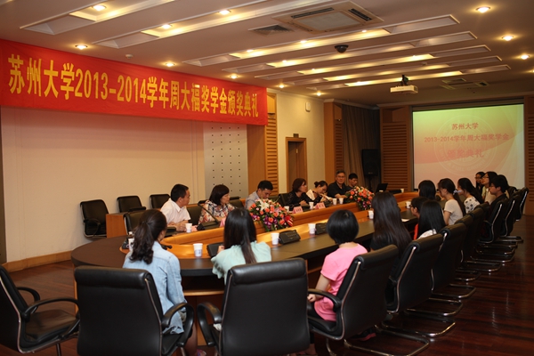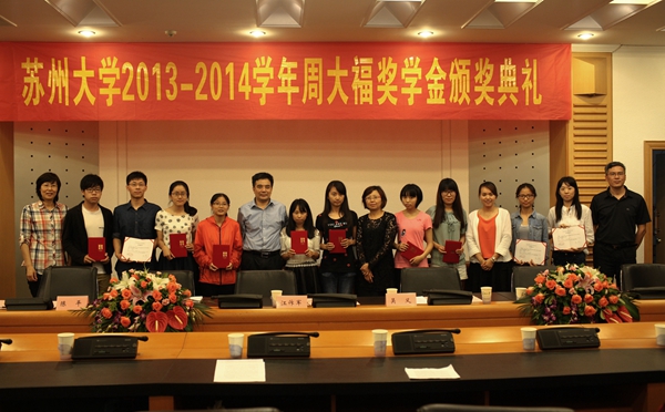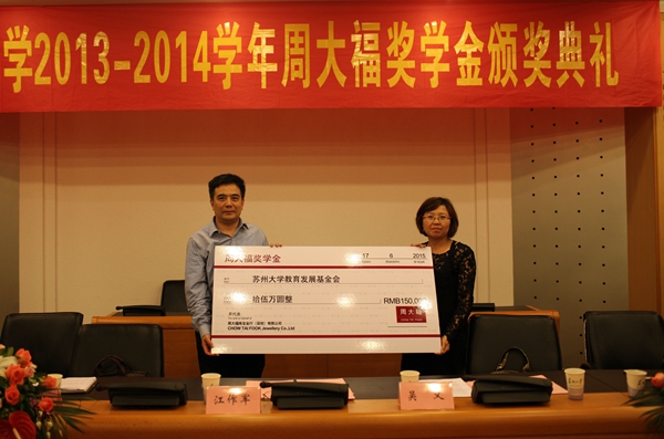 6月17日下午,苏州大学2013—2014学年周大福奖学金颁奖仪式在本部红楼207会议室召开。周大福珠宝华东区区域常务副总经理吴义,周大福珠宝华东区人力资源部高级主任吴钰桦,我校党委副书记、副校长江作军,学生工作部(处)部(处)长陈晓强,发展委员会办公室主任赵阳等嘉宾、老师以及获奖的30位学生参加了此次颁奖仪式。此次仪式由学生工作部(处)副部(处)长陈平主持。