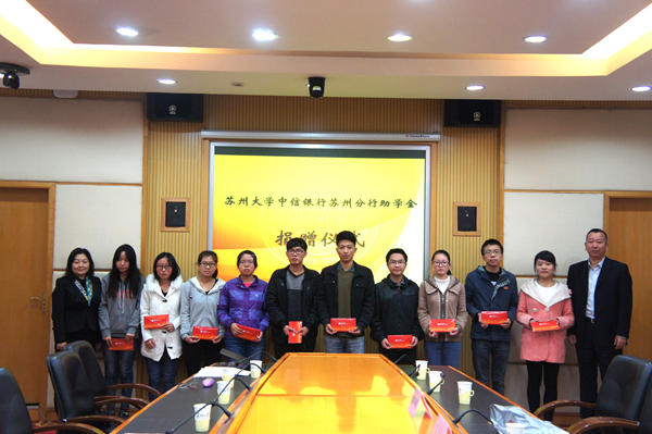 11月11日下午,中信银行苏州分行助学金捐赠仪式在我校红楼会议中心201会议室举行。参与本次会议的有中信银行苏州分行党群监保部总经理马立新、总经理助理周丽娟,我校学生工作部(处)部(处)长陈晓强、副部(处)长陈平,以及20位获助学生。
