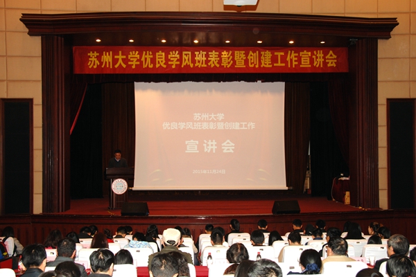11月24日晚上,苏州大学优良学风班表彰暨创建工作宣讲会在校本部敬贤堂举行。校党委副书记、副校长江作军,副校长蒋星红,本科教学督导委员会主任委员戴苏明、副主任委员杨亚安,教务部教学质量与资源管理处处长晏世雷,党委宣传部常务副部长孙宁华,学生工作部(处)部(处)长陈晓强,校团委书记肖甫青,学生工作部(处)副部(处)长陈平出席本次会议。各学院(部)学生工作分管领导、学工办主任,2013-2014学年优良学风班、优良学风示范班获评班级及2015-2016学年优良学风班创建班级代表参加了会议。会议由学生工作部(处)副部(处)长董召勤主持。