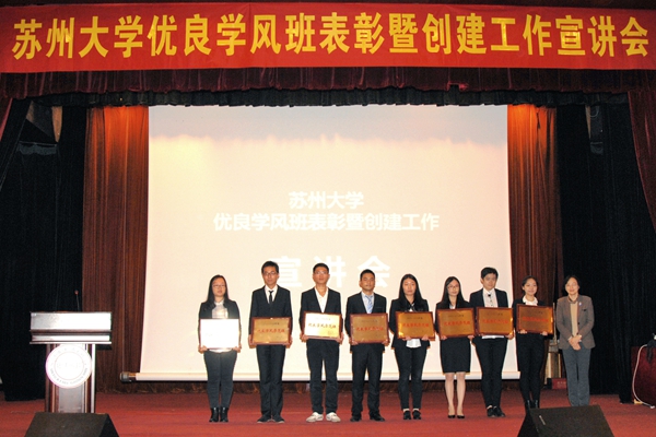 随后,晏世雷宣读了《关于表彰2013-2014学年苏州大学优良学风班的决定》。蒋星红为8个优良学风示范班颁发了奖牌。