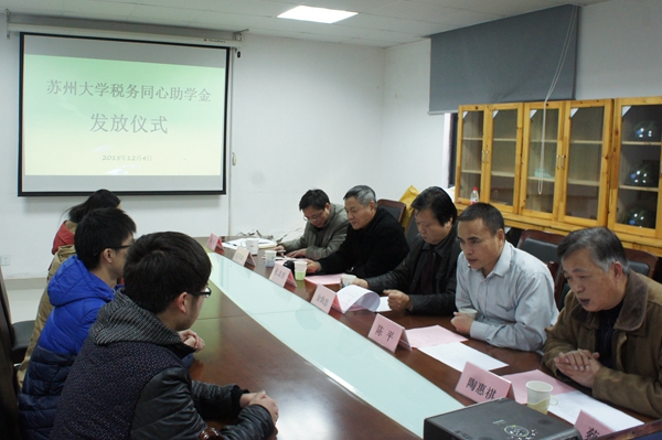 12月4日下午,苏州大学2015年税务同心助学金发放仪式在学生工作部(处)107会议室举行。参加本次发放仪式的有江苏大公税务师事务所所长金炳忠、部长孔志坚、工会主席陶惠祺、综合部副部长缪国新,我校学生工作部(处)副部(处)长陈平、杨燕老师及全体受助同学。
