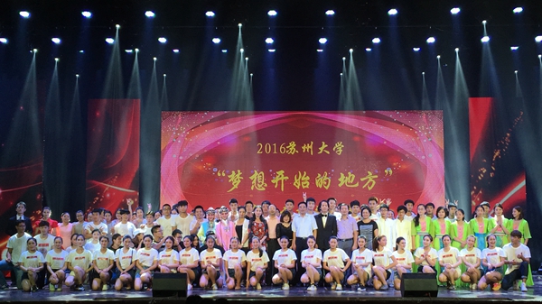 9月25日,由我校艺术教育中心联合校党委宣传部、学生工作部(处)、团委、人武部共同举办,东吴艺术团承办的“梦想开始的地方”2016年苏州大学迎新生文艺演出在天赐庄校区存菊堂圆满落幕。一场精心策划并具有高质量水准的文艺演出倾情奉献给我校2016级新同学。