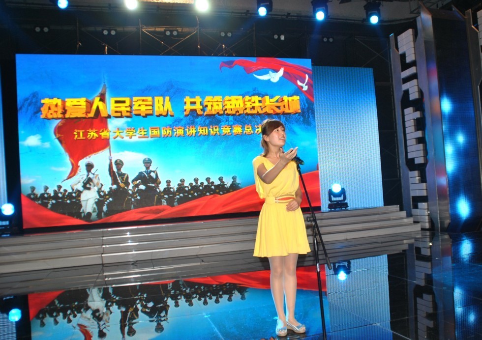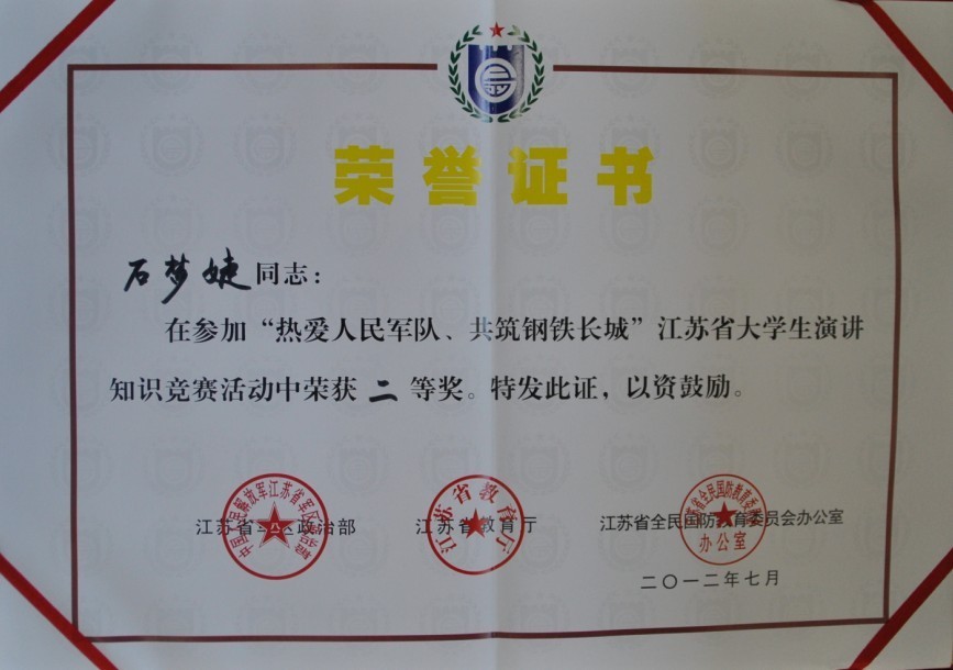 此次竞赛是我省庆祝建军85周年系列活动之一,旨在进一步增强在校大学生的国防观念,激发他们的爱国热情,为党的十八大召开营造浓厚的政治氛围。今年6月,全省126高校分成3个片区进行预赛,在苏南片区高校预赛中石梦婕同学脱颖而出,成功进入最终决赛。为赛出水平、赛出风格,学校领导高度重视,有关部门和相关学院大力支持,人武部(军事教研室)全体人员主动放弃暑假休息时间,邀请学校有关方面的专家教授对选手的演讲内容、演讲技巧、礼仪着装、知识测试题准备等进行了为期十天的强化训练。
