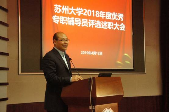 为深入学习贯彻习近平新时代中国特色社会主义思想和党的十九大精神,落实立德树人根本任务,加强我校辅导员队伍建设,促进辅导员专业化、职业化发展,4月12日下午,苏州大学2018年度优秀专职辅导员评选述职大会在我校本部红楼学术报告厅举行。校党委常委、副校长刘标,党委宣传部、学生工作部(处)、团委、研究生院等部门负责人,以及全体专职辅导员参加了本次活动。活动由学生工作部(处)副部(处)长潘爱华主持。