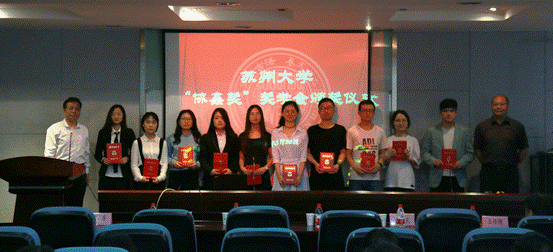 徐美华宣读了2016-2017学年苏州大学“协鑫奖”奖学金的获奖学生名单。闻曙明、刘标随后为获奖学生代表颁发证书,并合影留念。