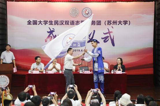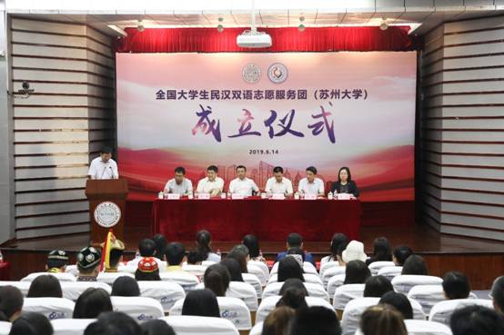 6月14日上午,国家民委、中央宣传部、中央文明办、教育部、共青团中央五部委在红楼学术报告厅举行全国大学生民汉双语志愿服务团(苏州大学)成立仪式。国家民委教育科技司司长田联刚、中宣部宣传教育局副局长韩流、江苏省民宗委副主任徐刚、国家民委教育科技司民族语文处处长王学荣、教育部民族教育司双语处干部兰正彦、我校党委副书记邓敏等出席仪式。会议由学生工作部(处)处长孙庆民主持。