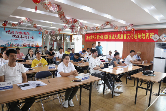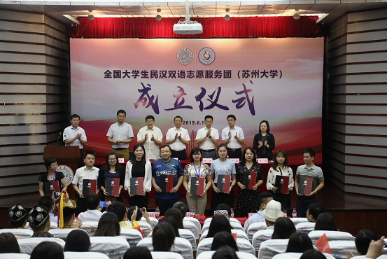 习近平总书记指出,“语言相通是人与人相通的重要环节。语言不通就难以沟通,不沟通就难以达成理解,就难以形成认同。”为了落实总书记重要指示精神,全面提高国民素质、发展科学文化、提高经济和社会信息化水平、增进各地区各民族之间的交流与沟通、增强中华民族凝聚力,我校在国家部委及江苏省有关方面的指导下,成立全国大学生民汉双语志愿服务团(苏州大学),为不通晓国家通用语言文字的少数民族进城务工经商同胞提供志愿培训服务。我校也被确定为第二批6所全国大学生民汉双语志愿服务团建设单位之一,也是散居地区唯一入选民汉双语志愿服务团的高校。